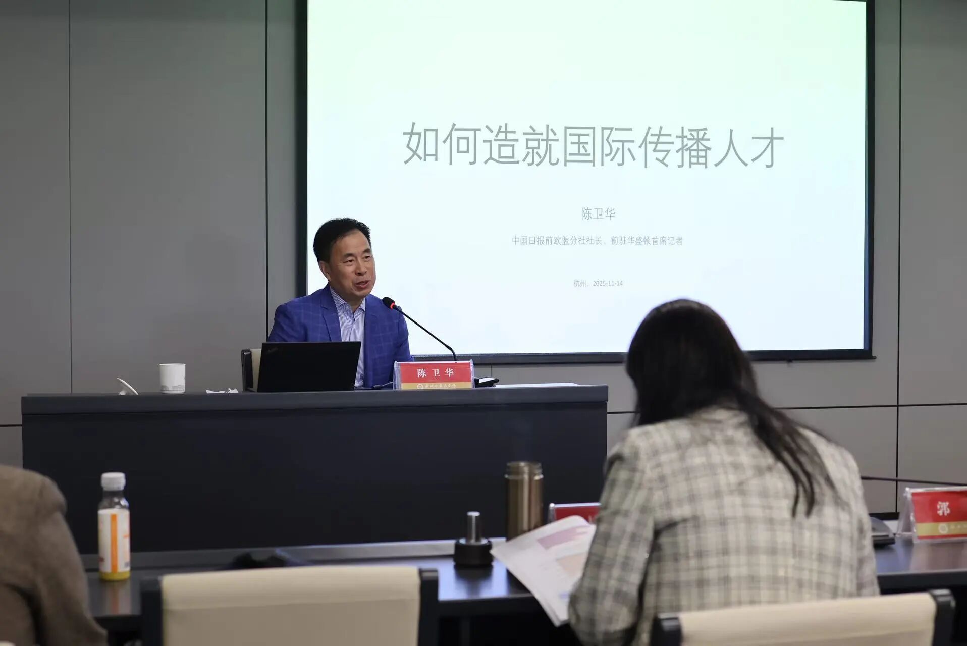 11月14日下午,我校博达论坛第1078期顺利举行。本次论坛特邀中国日报前欧盟分社社长、前驻华盛顿首席记者陈卫华作题为“如何造就国际传播人才”的学术讲座。中文学院特聘教授郭可、学院院长马宏程、学院党委书记杨飞群、学术副院长孟奕辰以及国际传播学科全体教师与2025级网络与新媒体专业全体同学参加了讲座。
