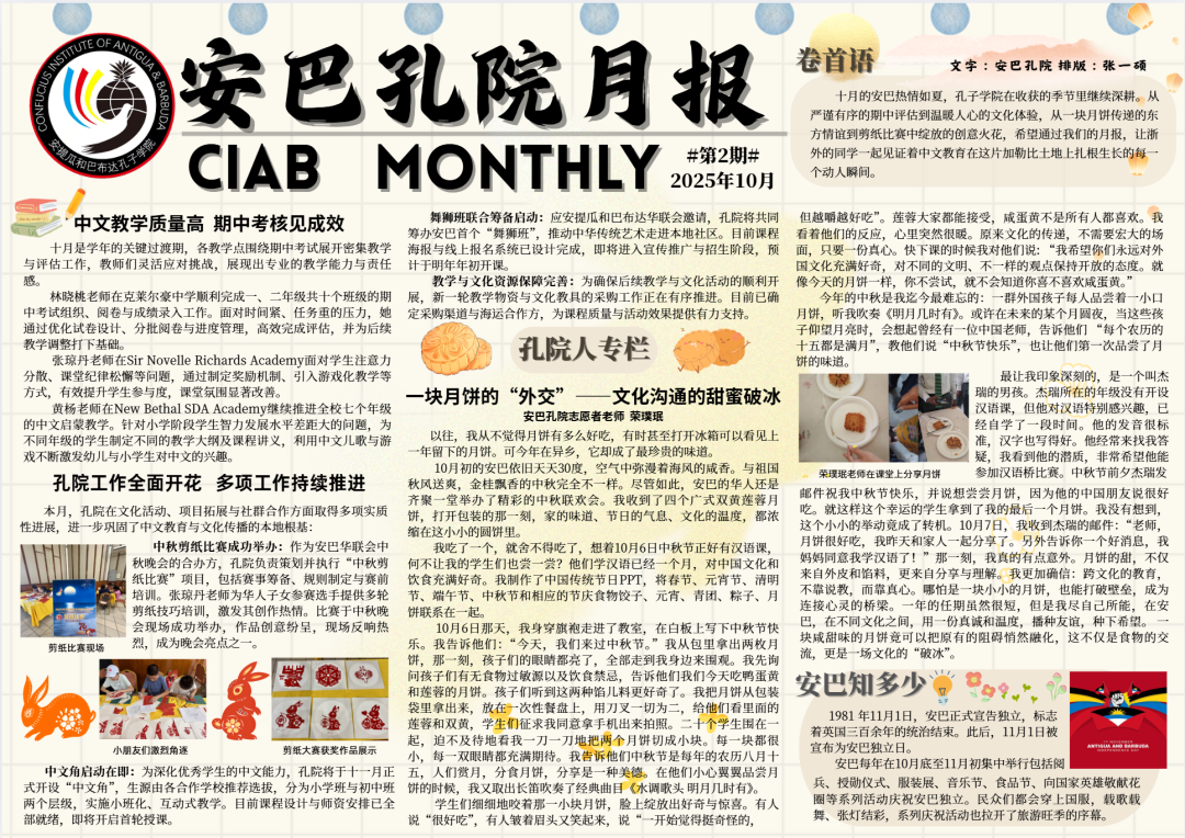 编者按:新学年的序幕在加勒比的微风中徐徐拉开,安提瓜和巴布达孔子学院迎来了崭新的开端。碧海蓝天之下,中文教学的种子在各校园中悄然播种、发芽。安巴与国内虽然相隔万里,中文让两个国家紧紧联系在一起,为了让安巴孔院充分发挥好桥梁作用,既向安巴人民普及中国文化,也向中国同学传递安巴的讯息,从而达到相识相知的目的。从今往后,每月一期,将安巴的点点滴滴带回国内,通过安巴孔院的努力,打开起相互了解的窗口。