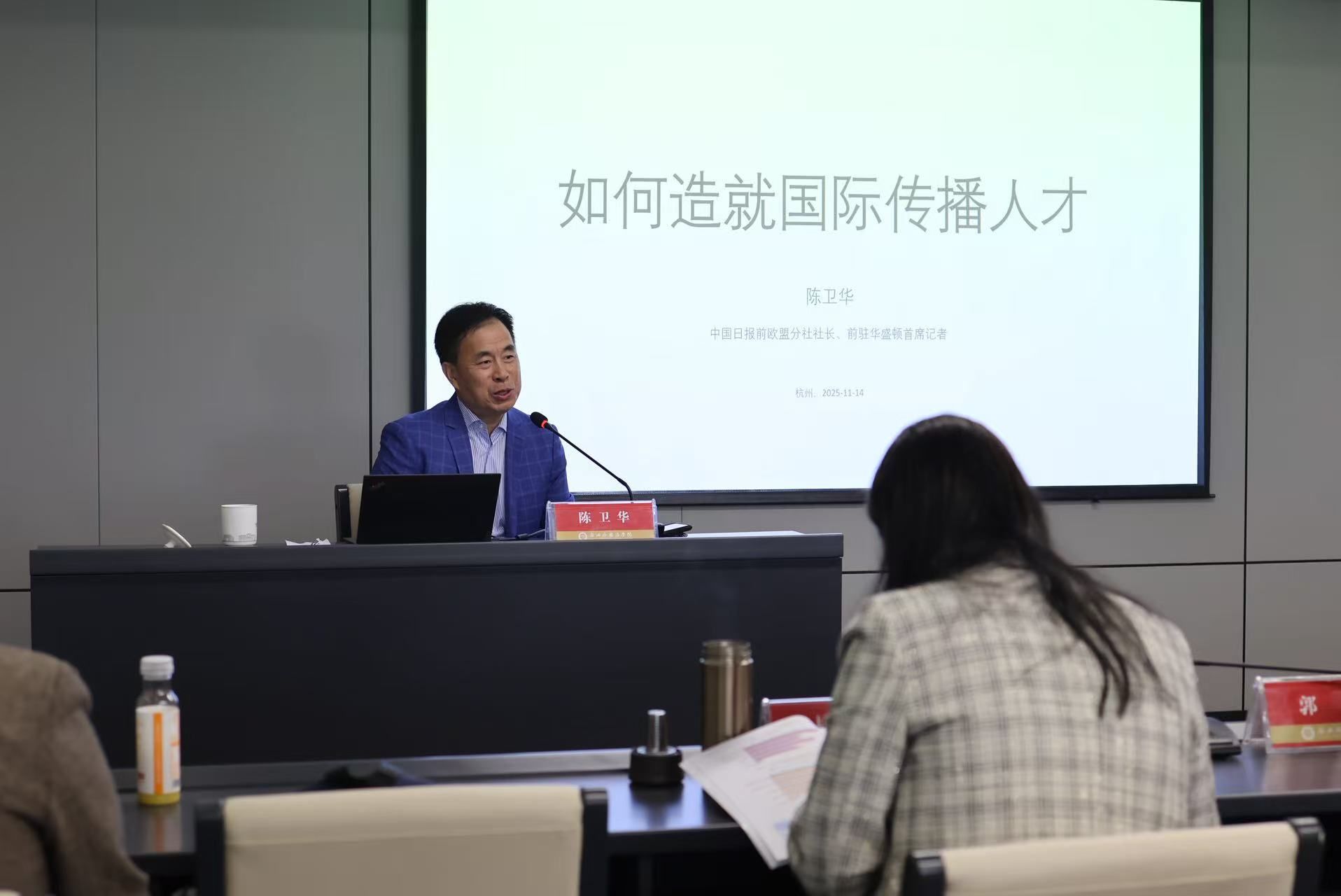 11月14日下午,我校博达论坛第1078期顺利举行。本次论坛特邀中国日报前欧盟分社社长、前驻华盛顿首席记者陈卫华作题为“如何造就国际传播人才”的学术讲座。中文学院院长马宏程、学术副院长孟奕辰、学院党委书记杨飞群、学院特别教授郭可以及网络与新媒体专业骨干教师与部分同学参加讲座。讲座由马宏程主持。