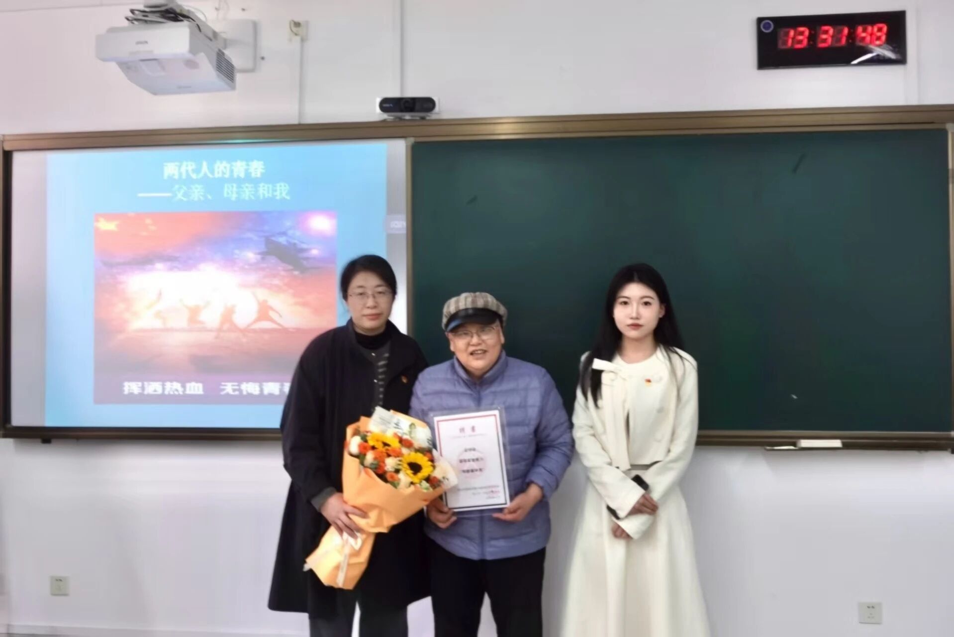 课前,我院专职组织员姚雯雯为其颁发“银龄辅导员”聘书,以期与其建立常态化育人机制。学生代表朱海伦为其献花以感谢胡老师心系青年成长的情怀。