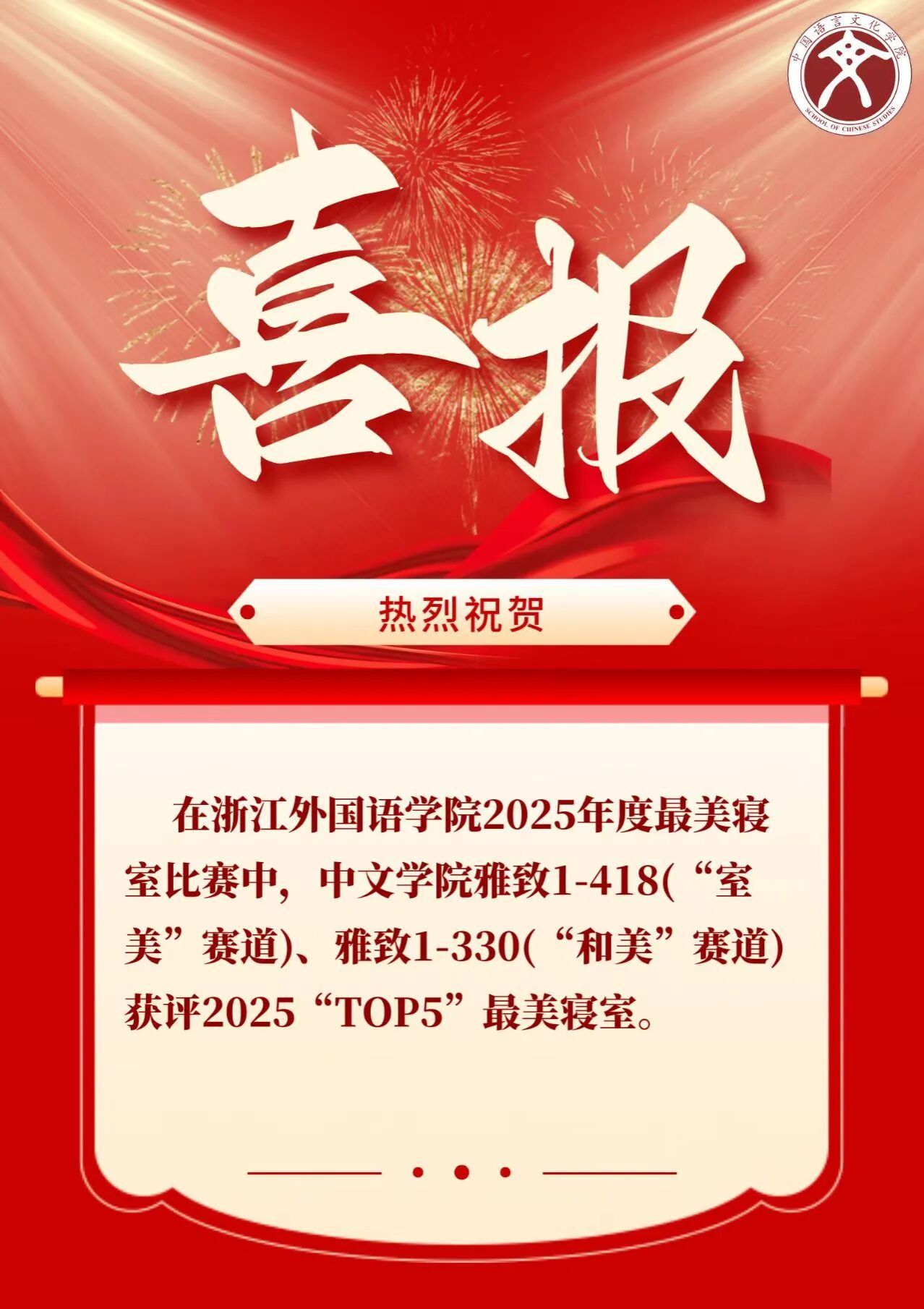 浙江外国语学院2025年度最美寝室大赛圆满完成!比赛设置 “室美”“学美”“和美”三个赛道,从创意设计、文化内涵、总体形象等方面进行综合评定。中文学院两个寝室获评2025“TOP5”最美寝室,分别是雅致1-418(“室美”赛道,寝室成员:23汉师2班程子圆、何若彤、高幸、央金拉姆)和雅致1-330(“和美”赛道,寝室成员:23汉师1班章宸迅、叶卓尔、郑一秀、黄晶锐)。恭喜以上寝室在本次比赛中获奖!