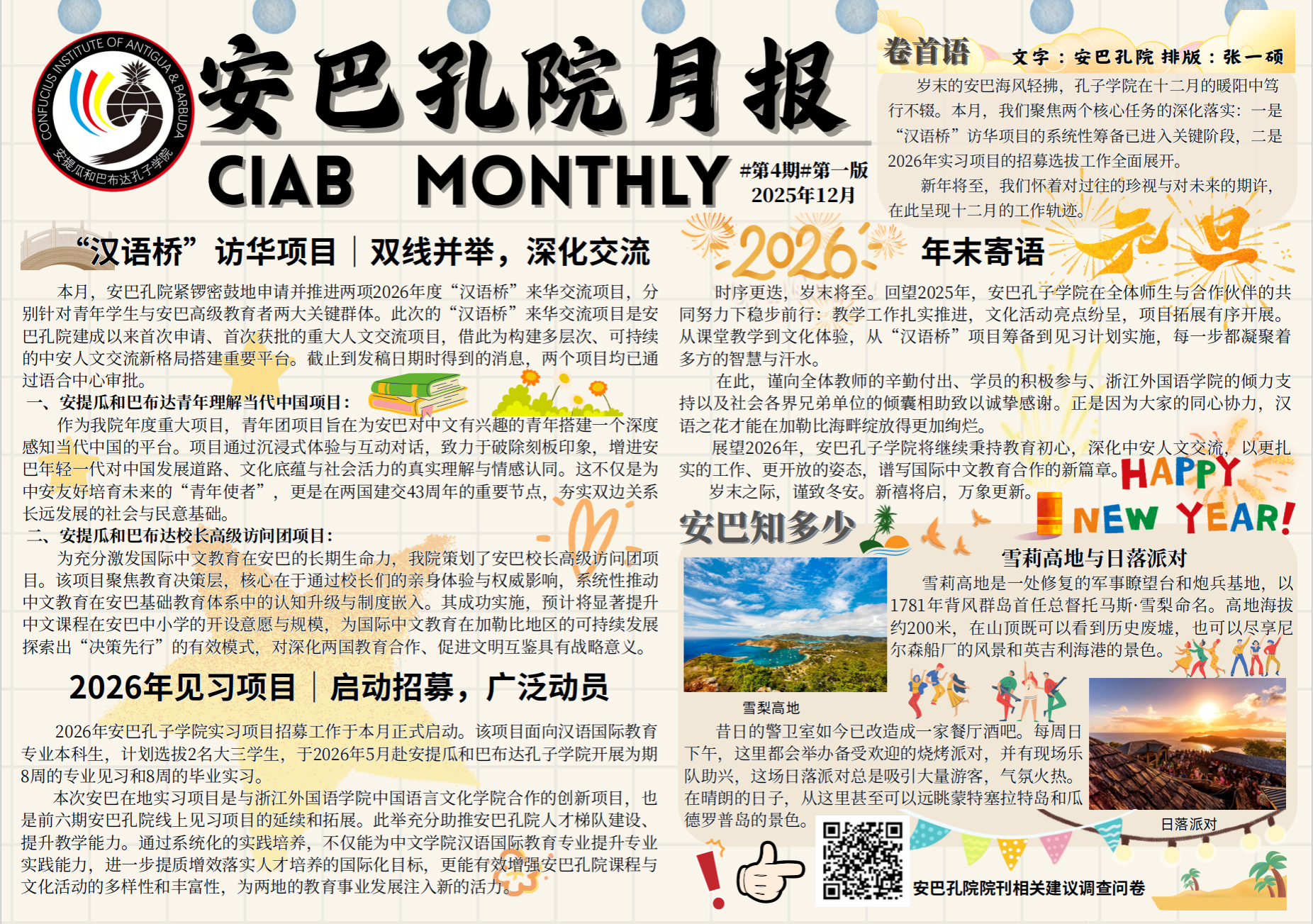 编者按:安提瓜和巴布达与中国虽然相隔万里,国际中文教育让两个国家紧紧联系在一起,为了让安巴孔院充分发挥好桥梁作用,既向安巴人民普及中国文化,也向中国同学传递安巴的讯息,从而达到相识相知的目的。每月一期的安巴孔院月报,将安巴的点点滴滴带回国内,通过安巴孔院的努力,打开中安相互了解的窗口。