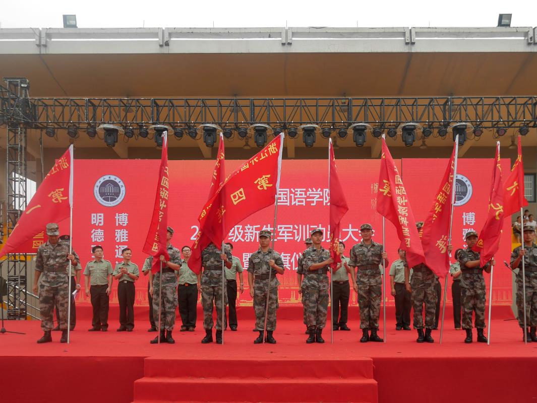 大会在庄严的国歌声中拉开帷幕。学校军训工作小组为总军训师授旗,军训师长向各军训团授旗。
